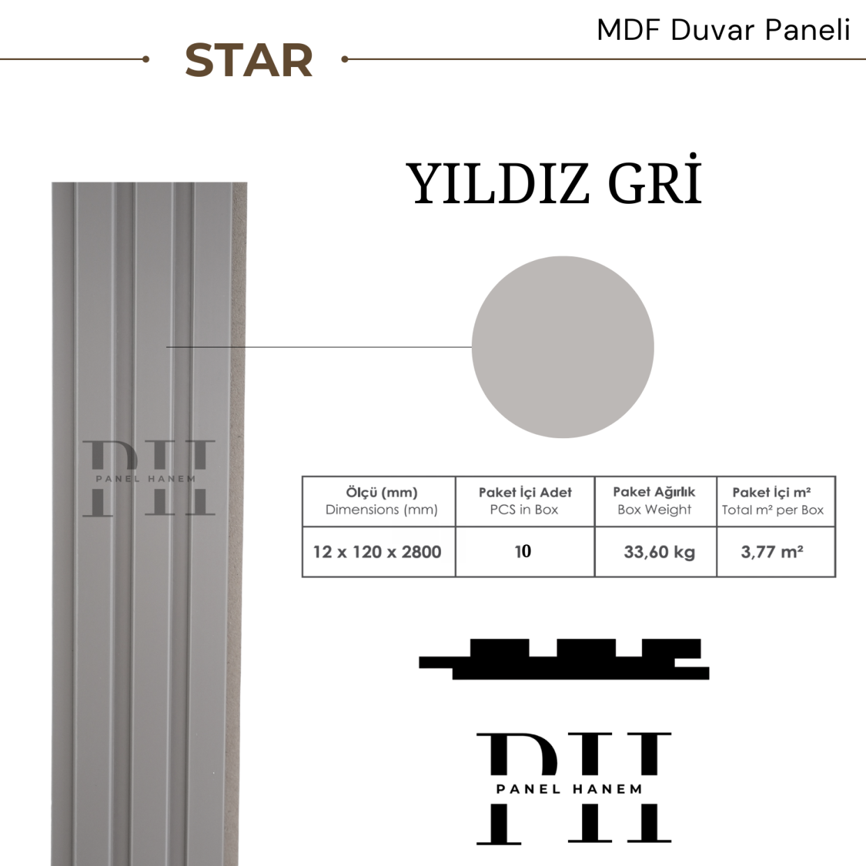 MDF duvar paneli, iç mekân dekorasyonunda estetik ve modern bir görünüm sunmak amacıyla üretilmiştir. Star 1212 Yıldız Gri modeli, özgün deseni ve ferah renk tonu ile yaşam alanlarına şıklık katar. Dayanıklı MDF malzemeden üretilmiş olup uzun ömürlü kullanım sağlar. Kolay uygulanabilir yapısı sayesinde duvarlarınıza pratik bir şekilde monte edilebilir. Temizliği kolaydır ve dekoratif amaçlı iç mekân kullanımına uygundur.